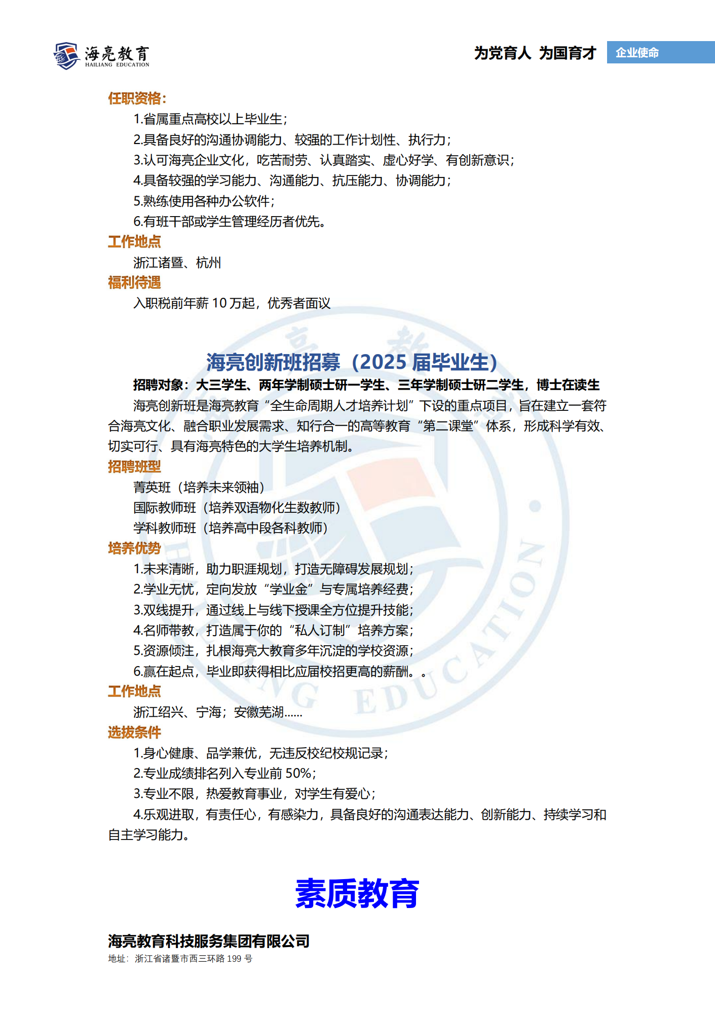 公司简介:海亮教育科技服务集团是世界500强企业海亮集团旗下的教育服务品牌,是国内教育服务提供商的引领者。依托近30年的办学经验与教育全产业资源优势,为公办、民办学校提供全面的综合管理服务,同时倾心打造自有特色高中、精品园所、特教机构,并为各级政府、教育机构、师生家长等客户提供涵盖教育科技、素质培训、课后服务、研学留学、生涯规划、教育后勤、师训干训等在内的多元优质教育服务,致力于成为全球领先的教育服务提供商。 截至2023年8月,已经为国内20余省超170所学校(含园所)提供综合管理服务,在校学生总数超22万人;多元优质教育服务覆盖全球超300万名师生。自成立以来,集团始终坚持“既讲企业效益、更求社会功德”,将“乡村教育振兴”作为集团发展永久的头等大事,力争在广大县域做到“服务一所学校、树起一面旗帜、孕育一片森林”,持续为“加快建设高质量教育体系、发展素质教育、促进教育公平”贡献海亮力量。 海亮教育视人才为生存发展的第一生产力,全面实施“人才兴教”战略工程,坚持“用最优秀的人培养更优秀的人”。在集团总裁、北京大学博士陈军伟的领航下,拥有正高级、特级教师与金牌教练超80人,清华北大毕业生超130人,双一流名校毕业生超1300人,教育研究及课程研发专职人才超1100人,以一流的师资队伍、卓越的管理团队为依托,做基础教育改革的先行者,做乡村教育振兴的耕耘者。 海亮教育高位实施“科技兴教”战略工程,推出教育数字化整体解决方案,聚焦“教、学、考、评、管”五大业务流程,围绕学生发展、智慧教学、教师提升、学校管理四个服务场景,基于教育研究、教育科技及咨询服务三大核心能力,持续输出知识研究型和教育科技型两种产品形态,通过一线“实验良田”打磨产品,协助学校快速提升管理与办学质量,以教育情怀培养“大写的人”。 在不断发展的同时,海亮教育赢得了社会的广泛认可和诸多荣誉,获得“中国最具综合实力教育集团”“中国民办教育十大品牌学校”“乡村振兴行动品牌”“社会公益教育品牌”“全国特色办学示范学校”“浙江省文明单位”“浙江省优秀基层党组织”等荣誉称号。