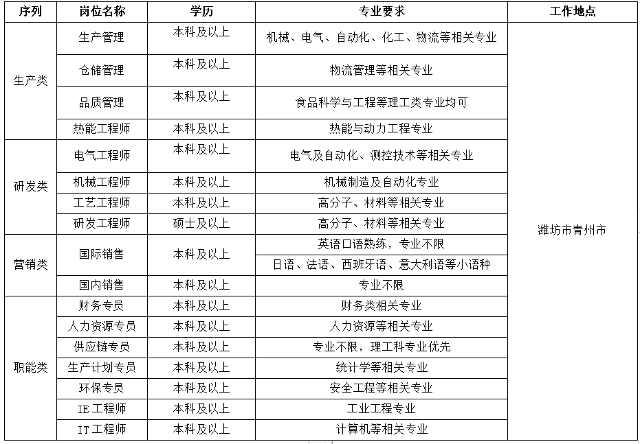 | 2023届管培生 | 专业不限 | 8000 - 10000 | 20 | 青州市峱山工业园齐王路9888号 | 任职要求: 1、财务专员:财务相关专业。 2、供应链专员:理工科类专业。 3、环保专员:环境工程相关专业。 4、生产计划专员:理工科类专业。 5、IE工程师:工业工程专业。 6、招聘专员:人力资源管理、工商管理、劳动与社会保障专业。 7、国际销售代表:英语口语流利者专业不限,商务英语、国际经济与贸易专业优先;其它小语种专业均可。 8、国内销售代表:专业不限。 9、生产管理:机械、电气、自动化、化工等相关专业。 10、品质管理:化工,高分子相关专业。 11、机械工程师:机械设计制造及其自动化及相关专业(硕士优先)。 12、电气工程师:电气工程及其自动化及相关专业(硕士优先)。 13、热动工程师:能源及动力工程专业。 | 正式岗位 |