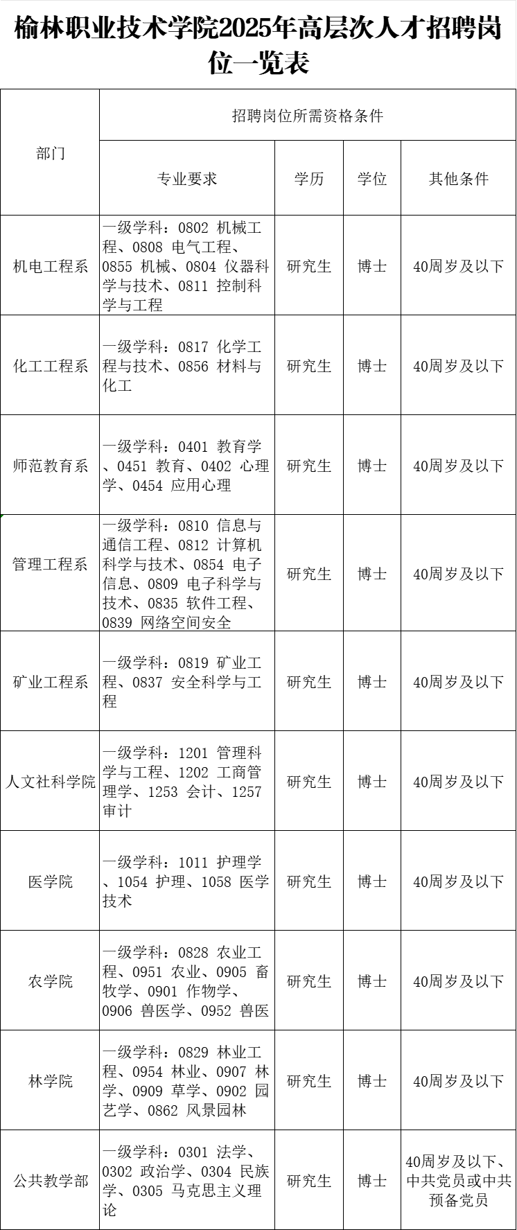 根据学校发展规划,近三年(2025-2028年)计划引进博士研究生100名。其中,2025年度引进目标为23名。具体信息和要求详见《榆林职业技术学院2025年高层次人才引进岗位需求表》(附件)。